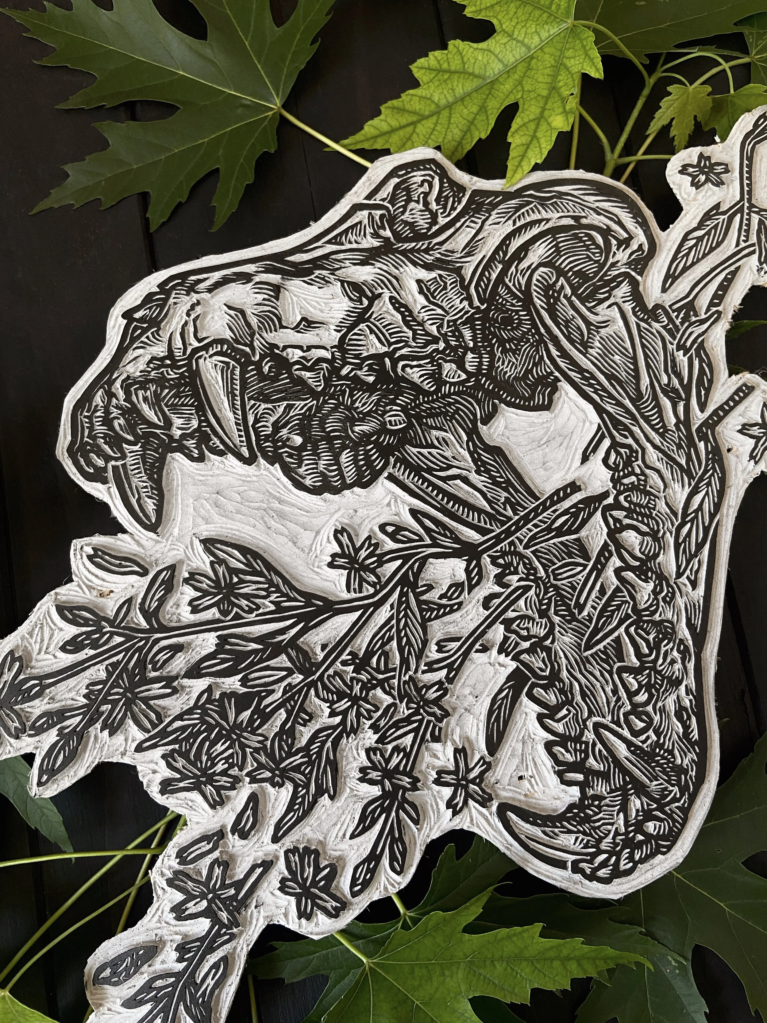 If you’re a fan of hand-printed art and crisp black and white, I’m happy to share that, at last, the linocut print of A Singular Violence, the fifth piece from my North American Megafauna Project, is on my studio table.