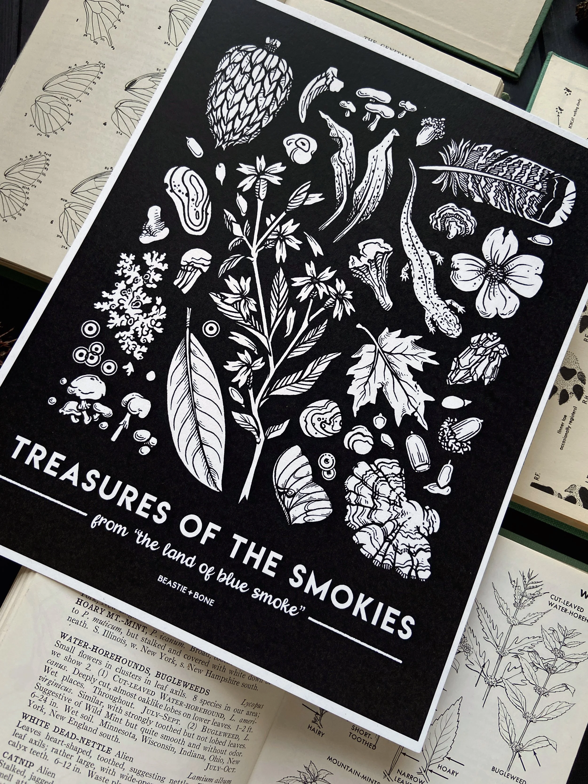 The latest lineup of new prints, linocuts, and goods, features paleoart options from limited edition linocut prints to lil recycled paper sabertooth fang stickers, and Smoky Mountains inspired flatlay illustrations and tinyprints with a plethora of woodland flora and fauna. A celebration of biodiversity past and present available just as summer hits in full lushness!
