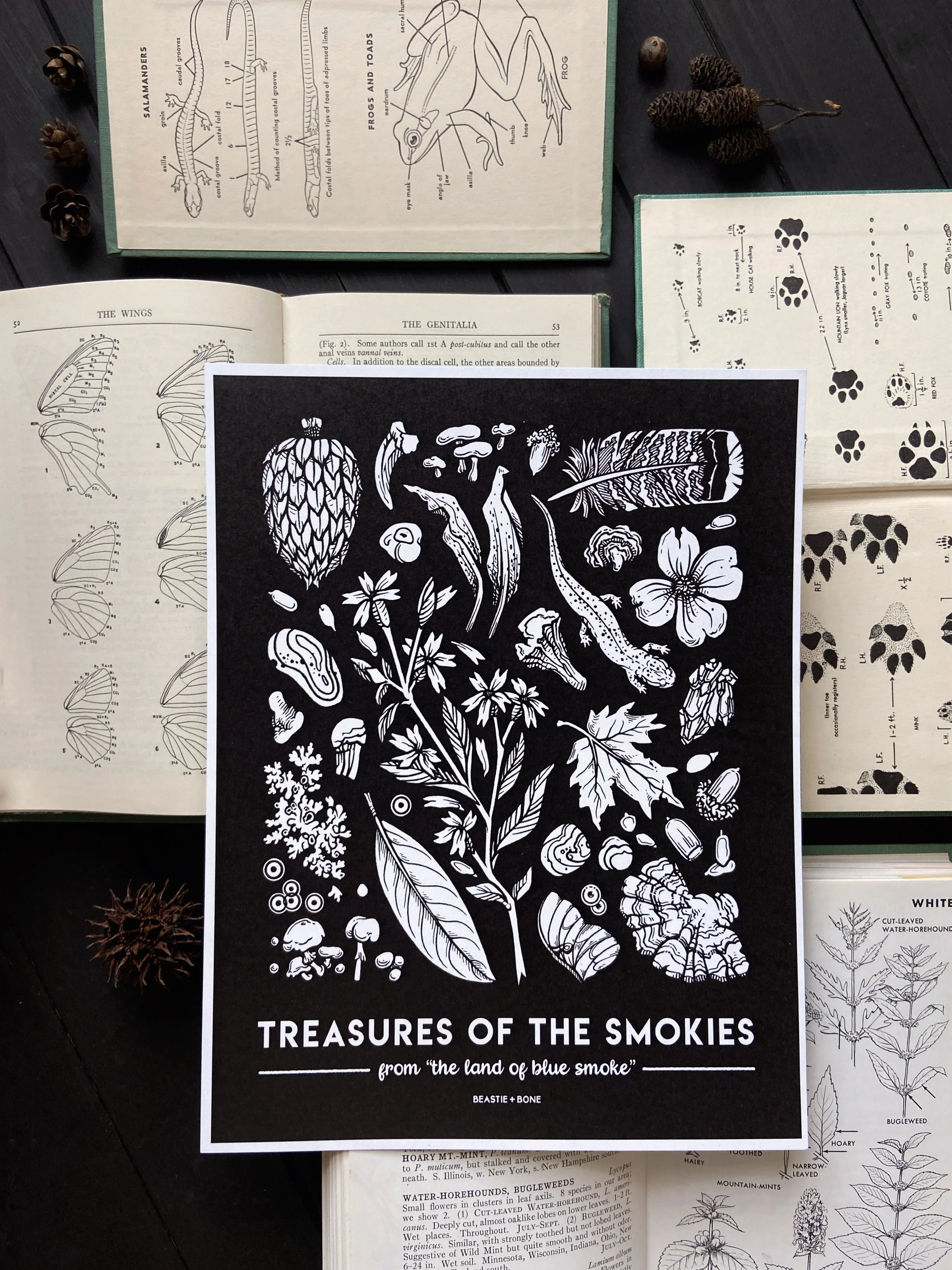 Treasures of The Smokies print and Salamander Linocut Tinyprint are available now to Beastie and Bone Patrons as part of their early access perk, and to all in the next shop update on June 29th, 2024.