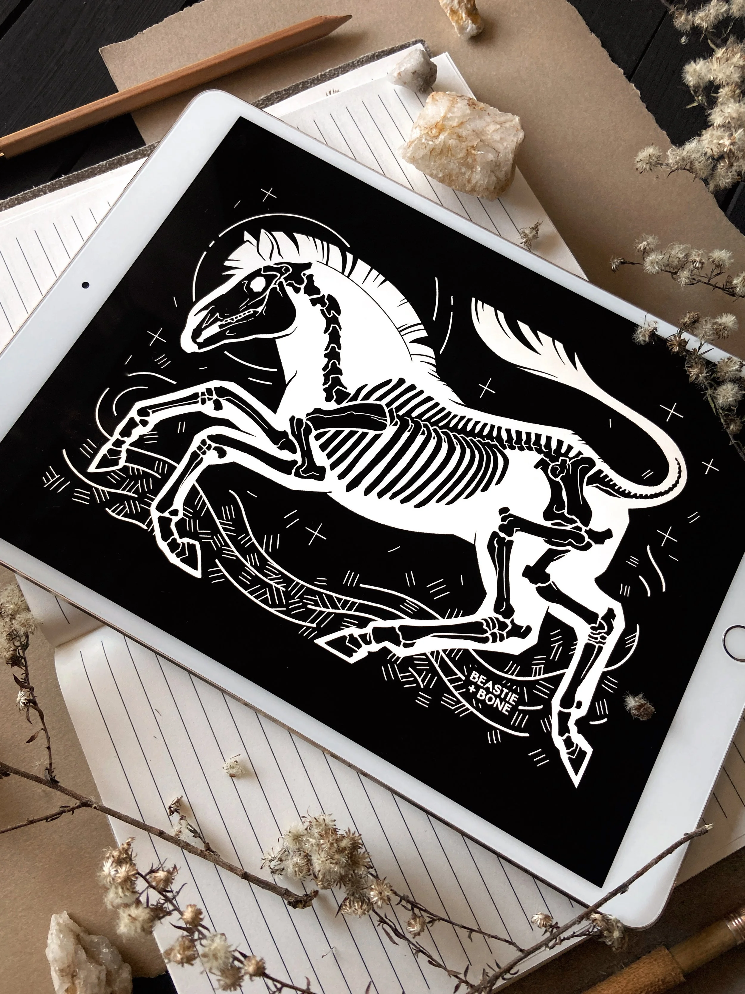 To create this month's illustration of E. simplicidens/Hagerman Horse, I took cues from the "glowing skeleton" stereotype with radioactive bones, cave paintings from the Pliocene and Pleistocene, and petroglyphs from the North American west. It was a fun lil extra to realize the hatching pattern I often do (3-5 lines repeated at different angles) when thinking closely resembles the repeated line texture found on a lot of petroglyphs. Guess I've just always had prehistoric art on the brain.