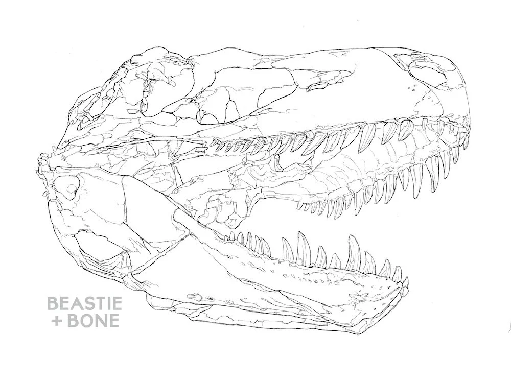 Sketch of an Appalachiosaurus skull based on photos taken by the artist at the Tellus Museum in Cartersville, Georgia for upcoming illustration and paper art piece From The Other Side of Time.