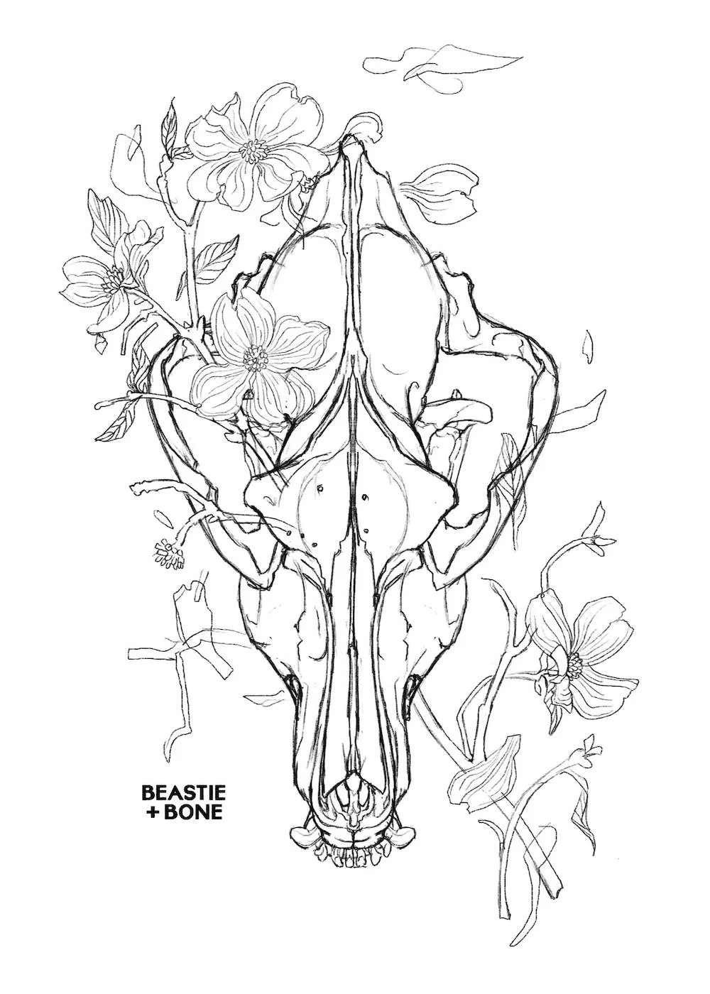 Sketch of dogwood and a direwolf skull, inspired by the natural history of the southeastern United States, and created specially in anticipation of the Dogwood Arts Festival!